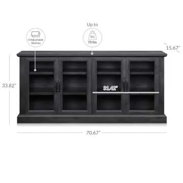 The cabinet measures 70 inches in length, providing ample space for storage and display.
