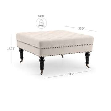 BELLEZE Modern 34 Inch Square Linen Ottoman with Caster Wheels, Contemporary Classic Footsool Bench with Button Tufted Top, Nailhead Trim, Wood Legs - Ravenna (Beige)