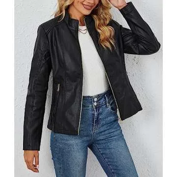 Show moreThe ultimate blend of style and practicality, this faux leather motorcycle jacket is designed for those who value both fashion and function. Crafted from high-quality PU leather, this jacket offers a durability that rivals traditional leather while ensuring you stay in vogue through all seasons. Its quilted design not only enhances its visual appeal, but the stand collar and front zip closure bring a classic edge that every wardrobe needs.
