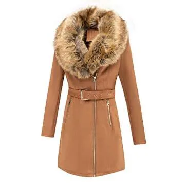 Bellivera Women Pea Coat Faux Suede Leather Long Jacket Winter Outerwear with Detachable Fur Collar 19249 Camel M