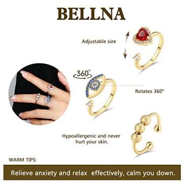 BELLNA 3Pcs Evil Eye Rings for Women 18K Gold Plated Cubic Zirconia Open Ring Set Adjustable Fidget Relieve Anxiety Rings for Women (EvilEye-Golden)