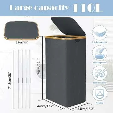 Bellzacasa Laundry Hamper with Lid, 110L Large Hampers for Laundry with Bamboo Handles and Removable Laundry Bag, Foldable Laundry Baskets with Lid for Bedroom Bathroom Tall Laundry Bin (Gray)