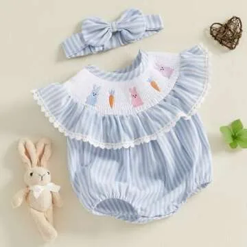 BemeyourBBs Newborn Baby Girl Easter Outfit Bunny Bubble Romper Embroidery Cute Smocked Baby Girl Clothes (Bunny Carrot Striped Blue, 12-18 Months)