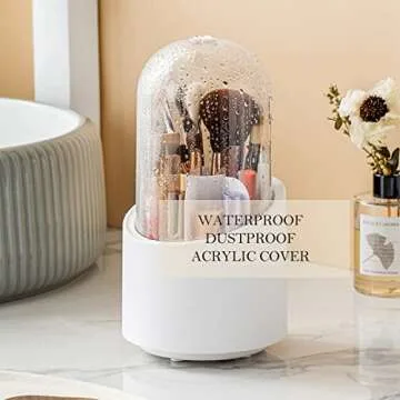 Benkaim Makeup Brush Holder Organizer, Dustproof & Waterproof 360 Rotating Cosmetics Acrylic Make up Brush Container Storage with Lid for Vanity Desktop Bathroom Countertop (White)