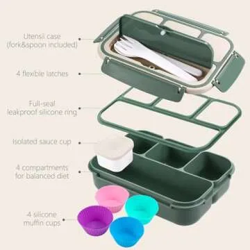 Bento Box Adult Lunch Box for Men Women, Bento Lunch Box for Kids Boys Girls School, Lunch Containers for Adults with 4 Compartments, Utensil set, Sauce Container, Muffin Cup, Dark Green