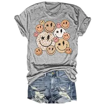 Show moreIntroducing the Beopjesk Women's Keep Smile T-Shirt, an exquisite blend of casual comfort and vintage style designed to brighten your wardrobe! Made from high-quality fabric, this short-sleeve tee features a delightful retro smiley face graphic that embodies positivity and happiness. Its soft material ensures all-day comfort, making it ideal for a range of activities, whether you’re lounging at home, meeting friends, or out exploring the city. The crew neck design adds an effortless touch to your casual outfit, letting you express your unique personality with ease.