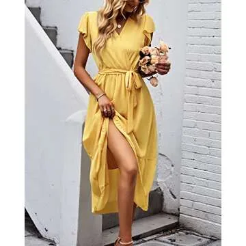 Bequemer Laden Women's Summer Floral Dress Wrap V Neck Short Sleeve Belted Ruffle Beach A-Line Bohemian Maxi Dresses D-Yellow