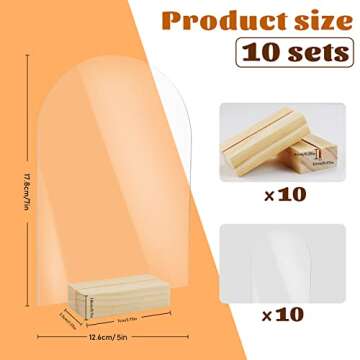 Show moreDiscover the elegance and versatility of the Bercoor 10 Pack 5x7 Inch Blank Clear Arch Acrylic Sign with Wooden Stands. This exceptional set includes 10 clear acrylic sheets sized at 5" x 7" (126mm x 178mm) and comes with sturdy wooden stands designed to enhance the presentation of your special events. Each acrylic piece features a protective film to maintain its clarity during transport and setup. Whether you're crafting customized signs or decorating tables for gatherings, these acrylic arches offer a sophisticated touch that’s sure to impress your guests.