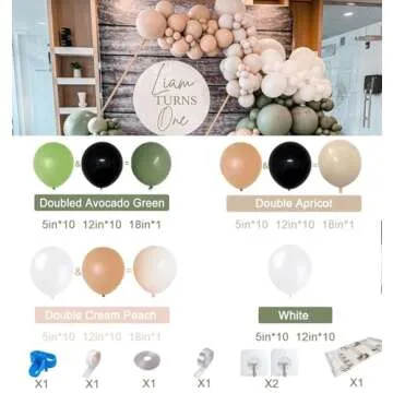 Show moreTransform Your Celebration with the Berichest Double-Stuffed Avocado Green Balloon Garland Arch Kit! This stunning decoration set brings a touch of trendy retro charm to your events. Featuring a beautiful blend of colors, this kit includes everything you need to create a captivating balloon display for weddings, baby showers, birthdays, and more. With 21 double avocado green balloons, 21 double apricot balloons, 21 doublestuffed cream peach balloons, and 20 elegant white balloons, your space will be filled with a fresh and vibrant atmosphere. Included in the kit are a 10m gold ribbon, dot glue tape, balloon arch tape, a tying tool, and easy-to-follow instructions for a seamless DIY experience.