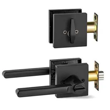 Show more Introducing the Berlin Modisch Entry Lever Door Handle and Single Cylinder Deadbolt Lock, a pinnacle of modern design and security engineered for both commercial and residential applications. This exquisite handle and lock set marries sophistication with functionality, offering a matte black finish and low-profile square design that effortlessly enhances your front door or office entrance. Every detail in this handleset reflects premium craftsmanship, delivering not only aesthetic appeal but also the robustness you expect from high-quality hardware.