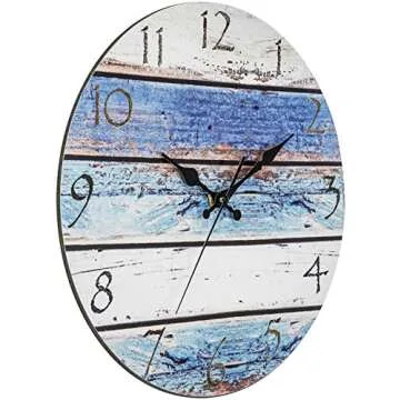Show moreIntroducing the **Bernhard Products Rustic Beach Wall Clock**—a perfect fusion of style and functionality for any coastal-themed space. With a charming 12-inch round design, this clock showcases a stunning navy blue and white wooden plank pattern that effortlessly enhances your decor. Crafted from durable MDF fiberboard, this clock offers a unique rustic aesthetic without the bulk of a traditional wooden clock. Its lightweight design not only makes it easy to hang but also ensures it fits seamlessly into any room, making it an appealing choice for a variety of settings.