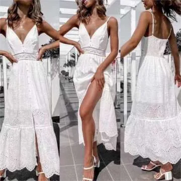 BerryGo Women's Embroidery Pearl Button Down Dress V Neck Backless Maxi Dress White-L