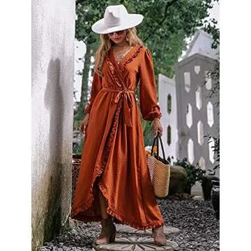 Show moreIntroducing the stunning BerryGo Women's Fall Bridesmaid Long Sleeve Wrap Ruffle Belted Dress, a versatile maxi dress that embodies elegance and comfort. This dress features enchanting butterfly sleeves and a graceful wrap v-neckline, exuding a boho flair that is perfect for any special occasion. Crafted with a flattering empire waist and an undetachable belt, it cinches your silhouette beautifully, enhancing your natural curves. The wrap skirt is adorned with playful ruffle trimmings along the hemline, adding a delightful swing to your stride, making it a must-have for bridesmaids and wedding guests alike!