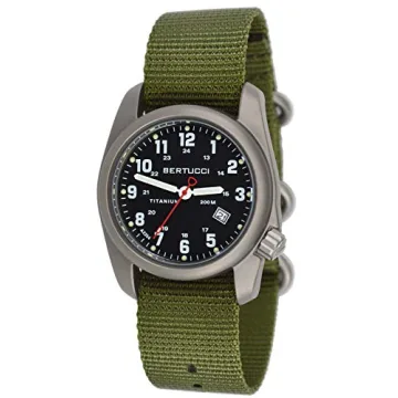 Show moreThe Bertucci Men's A-2T Original Classics is the ultimate field watch designed for those who seek adventure without compromising on style or functionality. Crafted with a robust 40 mm sand blasted matte finish solid titanium case, this watch seamlessly combines extreme durability with lightweight comfort. Its unique patented two-ply nylon Bertucci band, constructed through box stitch methods and featuring all metal hardware and grommets, provides unsurpassed durability and comfort for outdoor enthusiasts and those who appreciate a reliable daily wear.