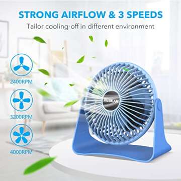 Show more Introducing the BESKAR USB Desk Fan, the perfect companion for both office and home settings. This compact yet powerful fan is designed to bring you relief from heat without taking up valuable desk space. With its dimensions of just 5.1 x 4.9 x 2.2 inches and weighing only 6 oz, it’s incredibly portable and easy to carry in your bag. Whether you’re at work, studying in a dorm, or enjoying a camping trip, you’ll always have a cool breeze at your fingertips.