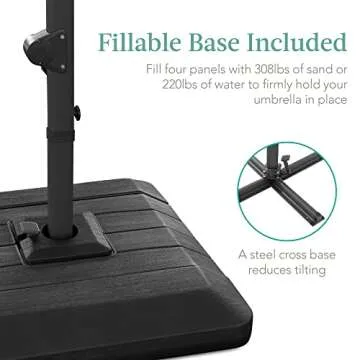 Show moreEnhance your outdoor experience with the Best Choice Products 10x10ft Cantilever Patio Umbrella, designed to provide the ultimate relaxing atmosphere for your deck, pool, or backyard. This high-quality umbrella features a robust, fillable base that ensures stability while elegantly shading a generous area of 100 square feet. Choose between sand or water for filling your base—sand for maximum weight (308 lbs.) and water for easy transportation (220 lbs.). The tan canopy beautifully complements any outdoor décor, making it a perfect addition for comfortable gatherings.