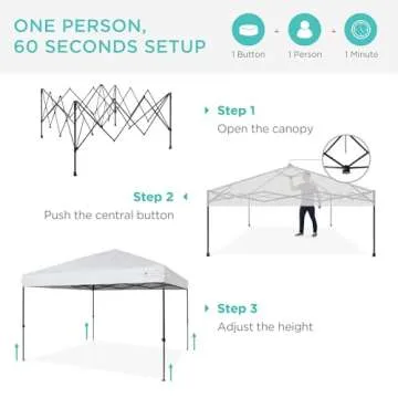 Show more Unleash the joy of outdoor gatherings with the ultimate solution for instant shade and comfort! This innovative product features a one-person setup design that makes setting up and breaking down your canopy a breeze. No more struggling with complicated mechanisms – simply open the canopy, push the central button, and adjust the height to suit your needs in under a minute. With 144 square feet of premium shade, it’s perfect for any outdoor occasion, from children's parties to camping trips.