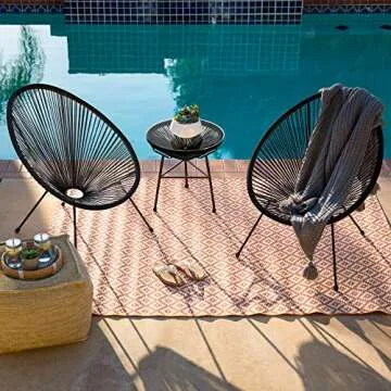 Show more Indulge in the elegance and comfort of our exquisite 3-Piece Outdoor Acapulco Set, the perfect addition to elevate your outdoor lounging experience. This set includes two beautifully designed armchairs and a stylish round accent table with a sleek tempered glass top, ensuring a blend of functionality and aesthetics. The armchairs feature a distinctive oval Acapulco style, boasting high backs woven with firm yet flexible ropes, allowing you to sink into them for the ultimate relaxation. Imagine enjoying endless afternoons with a loved one, sipping beverages or sharing snacks in this chic setting.