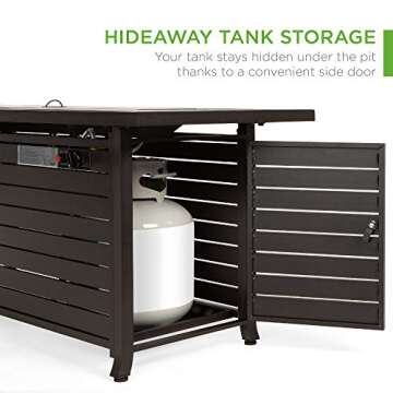 Show more Transform your outdoor space into a sophisticated gathering spot with the Best Choice Products 57in Propane Gas Fire Pit Table. Designed for modern elegance, this fire pit combines functionality with eye-catching aesthetics. Offering a powerful output of 50,000 BTUs, it efficiently warms your backyard or patio, making it an ideal choice for entertaining guests or enjoying a cozy evening outdoors. The fire pit features a hidden tank holder behind a stylish side door, allowing for quick access to a standard 20-pound propane tank while keeping it discreetly concealed. A securing strap is also included to ensure that your tank remains stable, no matter how lively the gathering becomes. Not only does this outdoor centerpiece serve as a heat source, but it also comes with a glass beads topping and a matching burner lid, providing an elegant touch that can easily transform the area into a functional table when the flames aren't needed.