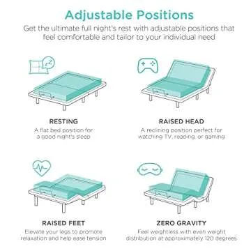 Show more Experience the ultimate in bedtime comfort and convenience with this innovative Adjustable Bed Base from a renowned brand. This bed base is designed to elevate not just your mattress, but also your entire sleeping experience. With a range of adjustable positions, you can effortlessly switch between your ideal settings, whether it's lounging while watching television or achieving a zero-gravity position that relieves pressure on your body. The customizable remote control makes it incredibly easy to find your perfect angle, allowing you to indulge in relaxation with just a touch of a button.