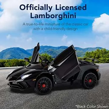 Show more Introducing the Best Choice Products Kids 12V Ride On Lamborghini Aventador SV Sports Car Toy in a stunning Cherry Red finish! This officially licensed Lamborghini is not just a toy; it gives children an exhilarating experience behind the wheel of an iconic sports car. With attention to detail and quality in mind, this ride-on car features the signature up-swept doors, authentic LED headlights, and an engaging horn sound to replicate the real driving experience. Designed for safety and fun, it is perfect for little car enthusiasts who dream of zooming around in a supercar.