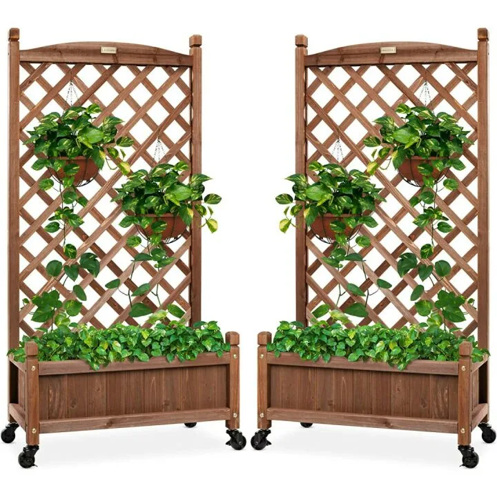 This exquisite SET OF 2 planters offers a transformative addition to any garden or balcony, blending the natural appeal of fir wood with the functionality of a mobile planter. The set capitalizes on the robustness of naturally weather-resistant fir wood, adorned with a rich walnut finish that not only emphasizes its style but also enhances its durability. Each planter features a 38-inch trellis in a tightly woven diamond lattice design, perfect for supporting climbing plants and adding vertical beauty to...