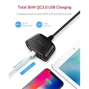 Show more Introducing the **BESTEK QC3.0 Cigarette Lighter Splitter**—your ideal companion for on-the-go charging! This innovative device transforms your car's single cigarette lighter socket into two powerful ports while adding an extra two USB QC3.0 ports. Whether you're embarking on a road trip or just commuting to work, this splitter ensures that you never run out of charging options. Capable of charging up to four devices simultaneously, it delivers a 36W total output with USB ports that provide rapid charging for your mobile devices like the iPhone 11, iPad, camera, Bluetooth speaker, and DVD player. The sturdy construction promises durability, making it a dependable accessory in your vehicle.