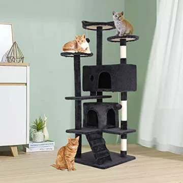 Show moreIntroducing the BestPet 54in Cat Tree Tower, the ultimate Playground and Sanctuary for your furry friends! Engineered with the needs of your indoor cats in mind, this multifunctional activity center is an ideal blend of fun, comfort, and security. Our sleek and modern design in Dark Gray not only elevates your home decor but also ensures your cats can enjoy their very own territory to climb, scratch, and nap. The thoughtfully crafted cat tree features three spacious perches at the top, allowing them to bask in the sun or simply observe their surroundings, while two cozy condos offer a perfect hideaway for those lazy afternoons.