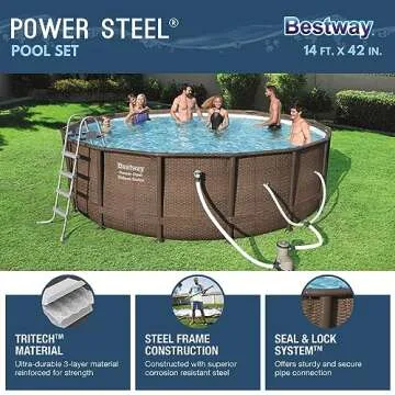 Show moreEnjoy endless summer fun with the Bestway Power Steel 14’ x 42” Round Above Ground Outdoor Backyard Swimming Pool Set. Perfectly sized for families and friends, this spacious swimming pool provides a refreshing escape from the summer heat. Constructed with a TriTech enhanced 3-ply PVC liner, it offers remarkable durability and stability, ensuring that it can withstand the joys and activities of summer after summer. This complete set is equipped with a Bestway pool sand filter pump, ChemConnect dispenser, a robust ladder for safe entry and exit, and a large pool cover to keep your pool clean and secure when not in use.