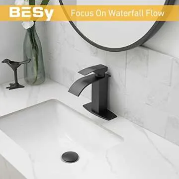BESy Black Waterfall Spout Bathroom Faucet, Single Hole 1 Hole 3 Holes Single Handle Bathroom Sink Faucet, Vanity Faucet with 6 Inch Deck Plate, cUPC Waterlines, Matte Black