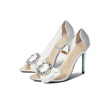Show moreStep into sophistication and style with the Betsey Johnson Women's SB-Moxie Pump. This stunning pair of heels combines a graceful pointed toe design with the bold charm of a large bow accentuated by a dazzling crystal buckle at the front. The exquisite ivory hue adds a classic touch, making these pumps a perfect addition to any fashionable wardrobe. With a sleek stiletto heel and stylish lucite sides, every step you take will radiate confidence and elegance. Whether you're heading to a gala, a wedding, or a night out with friends, these pumps are meticulously crafted to elevate your look and keep you comfortable all day long.