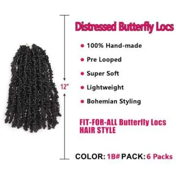 Show moreIf you're looking for a way to transform your hairstyle and make a bold statement, look no further than the 12 Inch New Hairstyle Pre-Twisted Butterfly Locs Crochet Hair. This remarkable product, made from 100% high-quality synthetic fiber, has been expertly crafted by professional braiders, ensuring that each loc is soft, neat, and tight, and remarkably resistant to spreading. With six packs, each containing 12 strands of luscious 12-inch locs, you’re well on your way to a full and fabulous hairdo in no time. It's a style that not only follows trending fashions but also embodies a goddess-like aesthetic that will undoubtedly turn heads.
