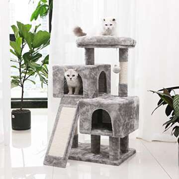 Show more Introduce your feline friend to a world of playful adventure with the BEWISHOME Cat Tree Condo. Designed specifically for kittens and adult cats alike, this activity center is the perfect blend of entertainment and comfort. Featuring durable sisal scratching posts, a dedicated scratching board, and an array of plush perches, your pet can explore, scratch, and lounge to their heart's content. The light grey color not only fits seamlessly into any room decor but also lends a modern touch to your living space.
