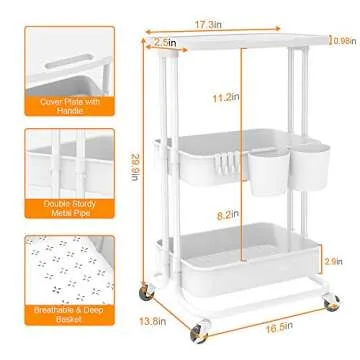Bextsrack 3-Tier Rolling Utility Cart with Wheels, Multi-Purpose Rolling Storage Carts with Cover Plate and Handle, Mobile Storage Organizer for Kitchen, Bathroom, Office, White