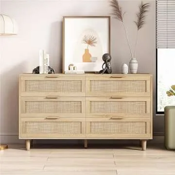 BFJDM 51.18'' 6 Drawer Rattan Storage Dresser Rectangle Wood Cabinet for Living Room Hallway Entryway Bedroom(Natural)