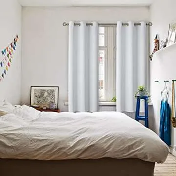 Show more Discover the perfect blend of style and functionality with our set of 2 greyish white blackout curtains. Measuring at 42 inches wide by 63 inches long, these curtains are designed to fit seamlessly into any window decor. Constructed with a grommet design, each panel features 6 durable silver metal grommets with a 1.6-inch inner diameter. This ensures compatibility with most standard curtain rods, allowing you to hang them effortlessly and slide smoothly when adjusting light levels.