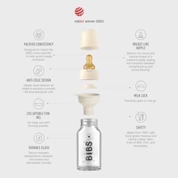 The BIBS Baby Glass Bottle Complete Set includes a 110 ml glass bottle, natural rubber nipples, and a sturdy lid.