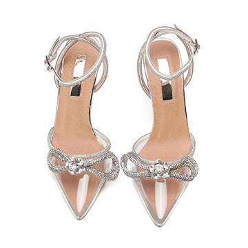 Bieosnli Women's Satin Lace Up High Heel Sandals Ankle Buckle Straps Pump Rhinestone Strip Bowknot Pointed Toe Stiletto Sandals Transparent 7