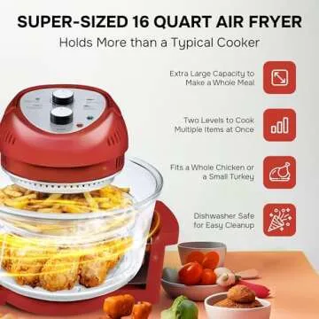 Big Boss 16Qt Large Glass Air Fryer Non Toxic – Large Halogen Oven Cooker with 50+ Air Fryers Recipe Book for Meals for Entire Family, Healthier Oil-Free Crispy Foods As Seen on TikTok