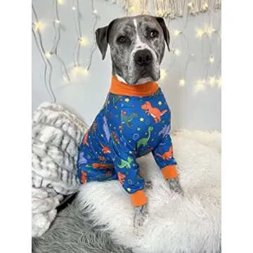 Show more Introducing the perfect solution for your furry friends who need a little extra warmth and comfort! Our adorable dog pajamas feature a delightful dinosaur print that will not only keep your pet cozy during cool days and nights but also make them the center of attention with their stylish design. Made from lightweight stretchy material, these PJs are designed to provide ease of movement and maximum comfort for all breeds and sizes. Whether your pup is romping around at home or snuggling up for a nap, they will appreciate the soft touch of these jammies that won’t irritate their sensitive skin.