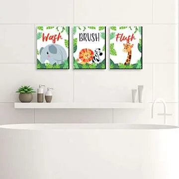 Show more Transform your child's bathroom into a vibrant jungle oasis with the Big Dot of Happiness Jungle Party Animals - Kids Bathroom Rules Wall Art. This playful, themed 3-piece art set is perfect for instilling good habits while brightening up your little one's space. Each panel features delightful jungle-themed designs that seamlessly blend fun and functionality, reminding kids to 'Wash, Brush, Flush' in a cheerful way. At a size of 10 inches high x 7.5 inches wide, these lightweight yet eye-catching prints stand out beautifully against any bathroom wall, offering a modern aesthetic that's as charming as it is practical.