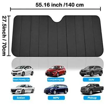 Show moreAre you tired of stepping into a sweltering vehicle after a long day in the sun? The Big Hippo Front Car Sun Shade Windshield is your ultimate solution to keeping your car interior cool and protected from the damaging effects of UV rays. This high-quality sunshade features a state-of-the-art double bubble design with silver coating that effectively blocks out up to 99% of UV rays, thereby safeguarding your dashboard, seats, and steering wheel from heat and fading. Measuring at a generous 55.16 x 27.5 inches, it is compatible with most SUVs, trucks, vans, and cars, ensuring a proper fit for various windshield sizes.