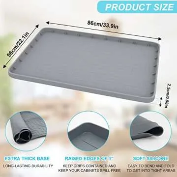 Show moreIntroducing the Bigger Under Sink Mat by LVJING, the ultimate solution for protecting your kitchen and bathroom cabinets from a variety of spills and leaks. With a generous size of 34'' x 22'', this mat is designed to fit perfectly under most standard 36-inch cabinets. The innovative lip stands at 1 inch high, allowing it to hold up to 3.3 gallons of liquid, giving you ample time to address any unexpected leaks. Crafted from high-quality soft silicone, this mat not only safeguards your cabinets but also provides a durable and stylish touch to your space.