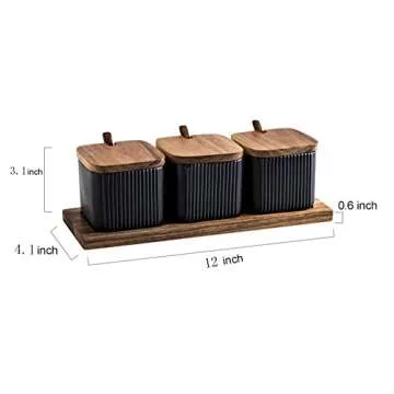 BIHOIB Black Porcelain Sugar Bowl Condiment Pot Salt Container with Wooden Lid, Spoon and Tray, Modern Spice Box Seasoning Jar, Set of 3