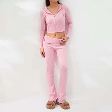 Biivrii Women Ribbed Knit 2 Piece Outfits Long Sleeve Zipper-Up Slim Fit Hooded Crop Tops High Waist Long Pants Loungewear