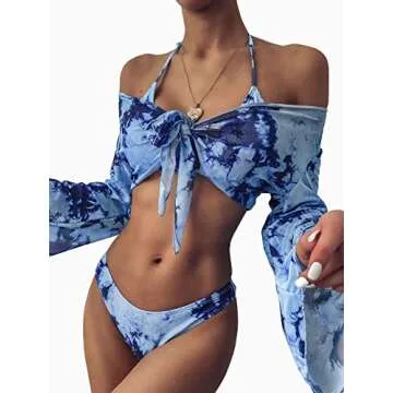 Bikini Swimsuit for Women, Tie Dye 3 Pieces Set, Knot Front Off Shoulder Cover Up with Halter Bikini Sets Bathing Suit (Blue, L)