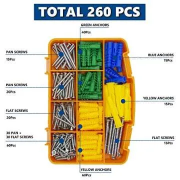 The kit includes 260 pieces of assorted plastic anchors and wall screws, designed for various hanging needs.