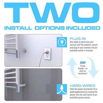 Show more Introducing the BILLY'S HOME Wall Mounted Electric Towel Warmer, a luxurious addition to your bathroom that combines functionality with modern design. Measuring at 31.5 x 23.6 inches, this towel warmer boasts a sleek black finish constructed with high-quality 304 stainless steel, ensuring durability and elegance. Available in both plug-in and hardwire options, it offers versatile installation to meet your specific needs. This appliance transforms your bathroom by not just warming towels but also enhancing the atmosphere, making it a sanctuary of comfort and relaxation.
