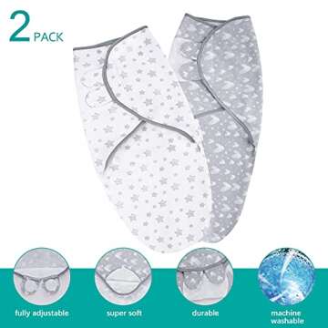 Discover the ultimate in comfort and security for your little one with the Biloban Baby Swaddles, designed for infants aged 0-3 months and weighing between 7-14 lbs. This delightful set features a charming grey hearts and white stars print, making it a stylish addition to any nursery. Measuring 29x22 inches, these swaddles offer a snug and reassuring fit, essential for a peaceful sleeping experience. Made from ultra-soft cotton, these swaddles provide a breathable and cozy environment for...