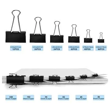 Show more Introducing the ultimate solution for every student, teacher, and professional: our 208 PCS High-Quality Black Binder Clips! These versatile clips come in 6 assorted sizes, providing flexibility for all your binding needs. Each set is neatly packed in 6 transparent boxes, making storage and access a breeze. Made from strong tempered steel, these clips are designed for durability and rust resistance, ensuring they can withstand daily use without faltering. The smooth powder coat finish and nickel-plated handles add to their longevity and style.